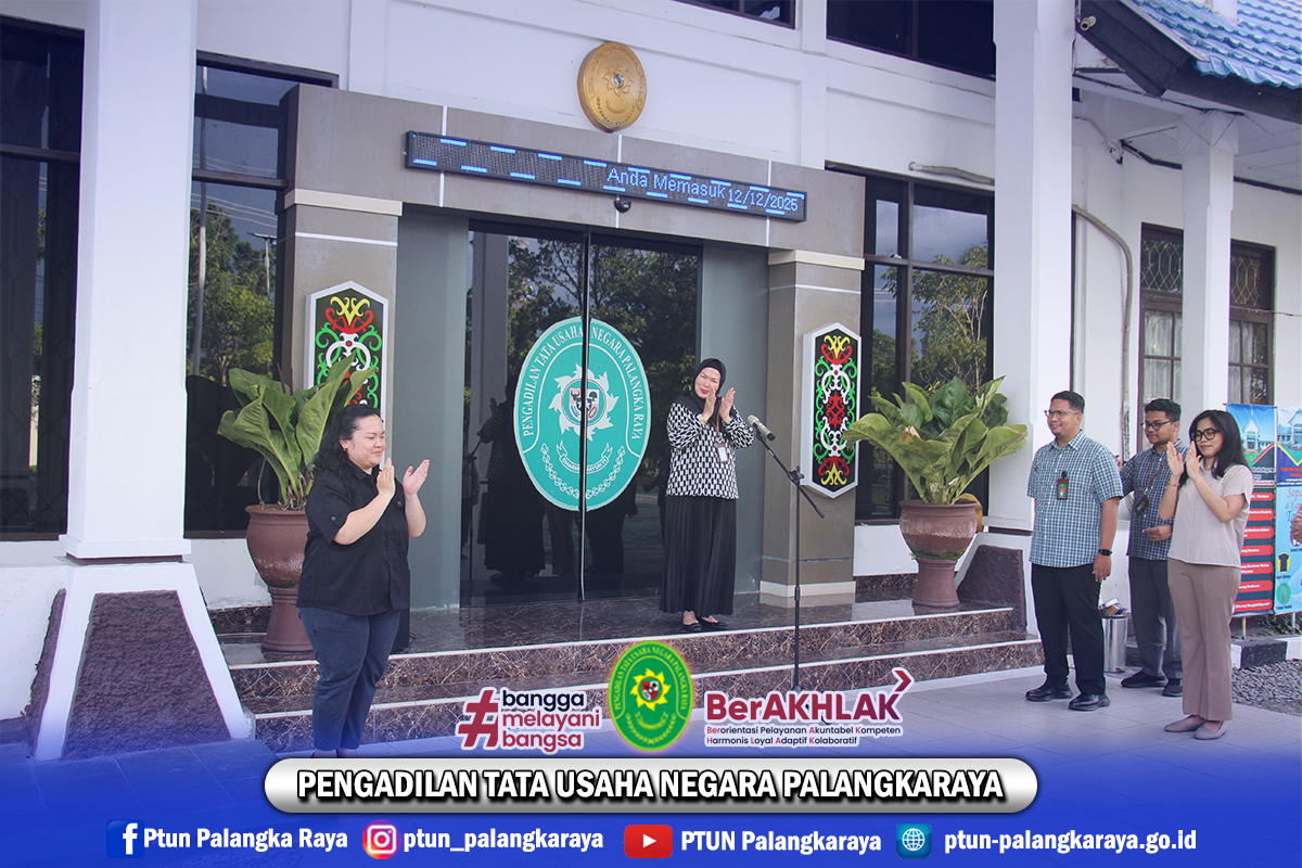 Pada hari Jumat, tanggal 12 Desember 2025 Pukul 17.00 WIB, Ketua, Hakim dan pegawai PTUN Palangkaraya melaksanakan Apel Sore. Kegiatan Apel Sore dipimpin oleh Ketua PTUN Palangkaraya, Ibu Liza Valianti, S.H., M.H. sebagai Pembina Apel; Kassubag Kepegawaian dan Ortala PTUN Palangkaraya, Bapak Supriansyah, S.H. sebagai Komandan Apel; dan Ibu Vita Seh Ukurta B.R. Tarigan, S.H. sebagai pemimpin yel-yel.