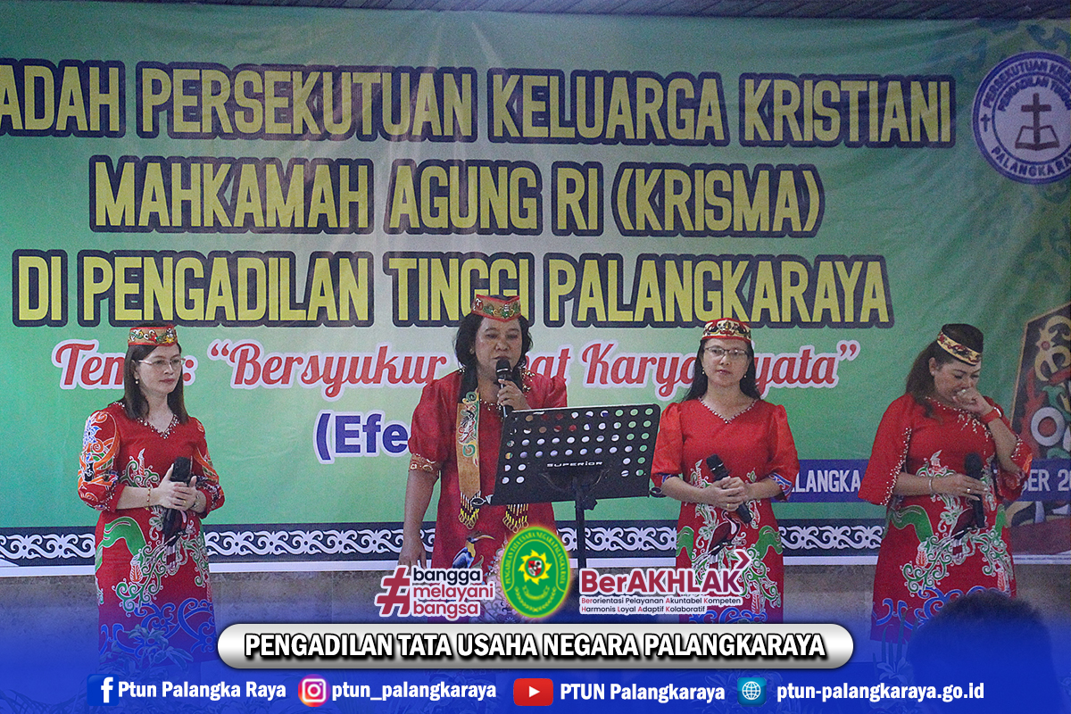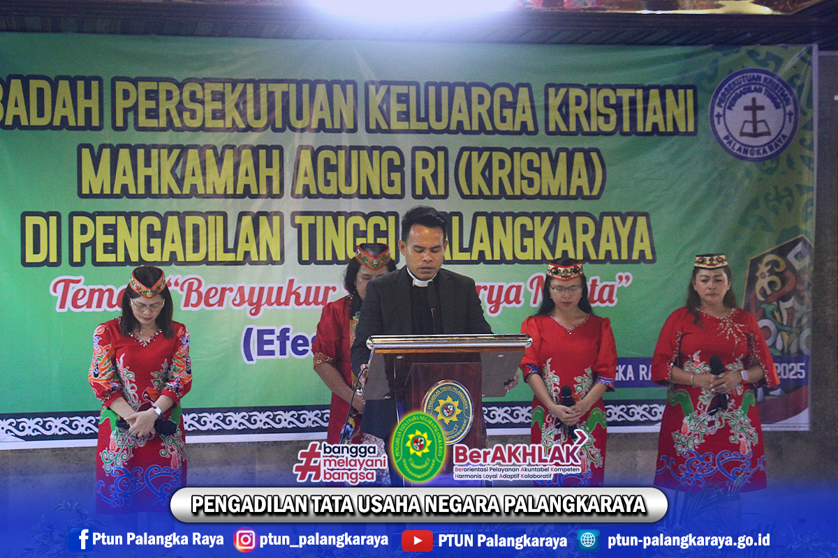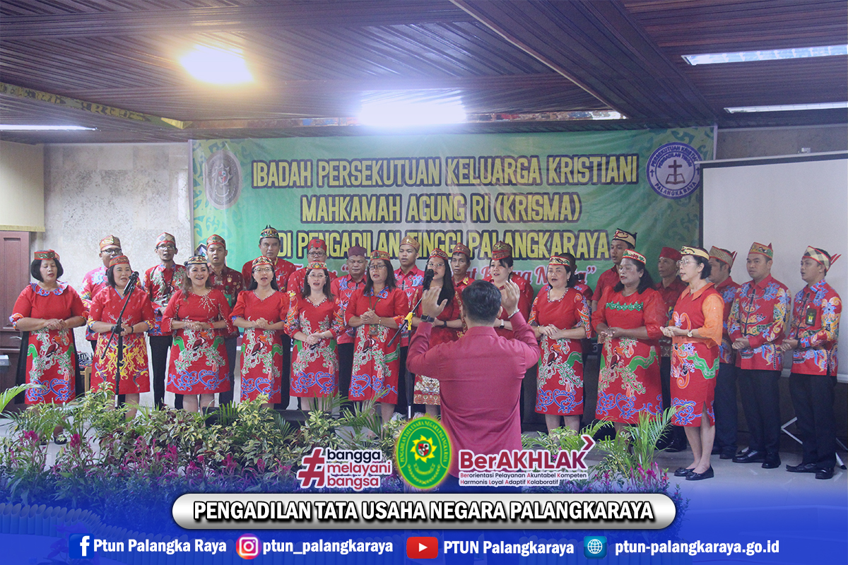 Berdasarkan surat undangan No 11/UND-PKI/IX/2025, Pegawai yang beragama Nasrani di PTUN Palangkaraya mengikuti ibadah Persekutuan Keluarga Kristiani Mahkamah Agung RI (KRISMA) di Pengadilan Tinggi Palangkaraya pada pukul 10.00 WIB sampai dengan selesai. Acara dibuka oleh Ketua Pengadilan Tinggi Palangkaraya, Ibu Dr. Pujiastuti Handayani, S.H., M.H., dilanjutkan dengan persembahan pujian dari PN Palangkaraya, PT Palangkaraya, dan PN Kasongan. Pengkhotbah dalam acara ini Adalah Pdt. Dr. Elisae Sumandie, M.Th. Dalam Khotbah yang disampaikan, pengkhotbah menekankan bahwasanya aparatur peradilan harus menghadirkan keadilan yang berbuah nyata, aparatur peradilan dalam melayani masyrakat harus dengan tulus dan Ikhlas karena sebagai bentuk ungkapan kepada Tuhan. Terakhir, pengkhotbah menekankan untuk menjaga integritas walaupun hal tersebut tidak mudah.