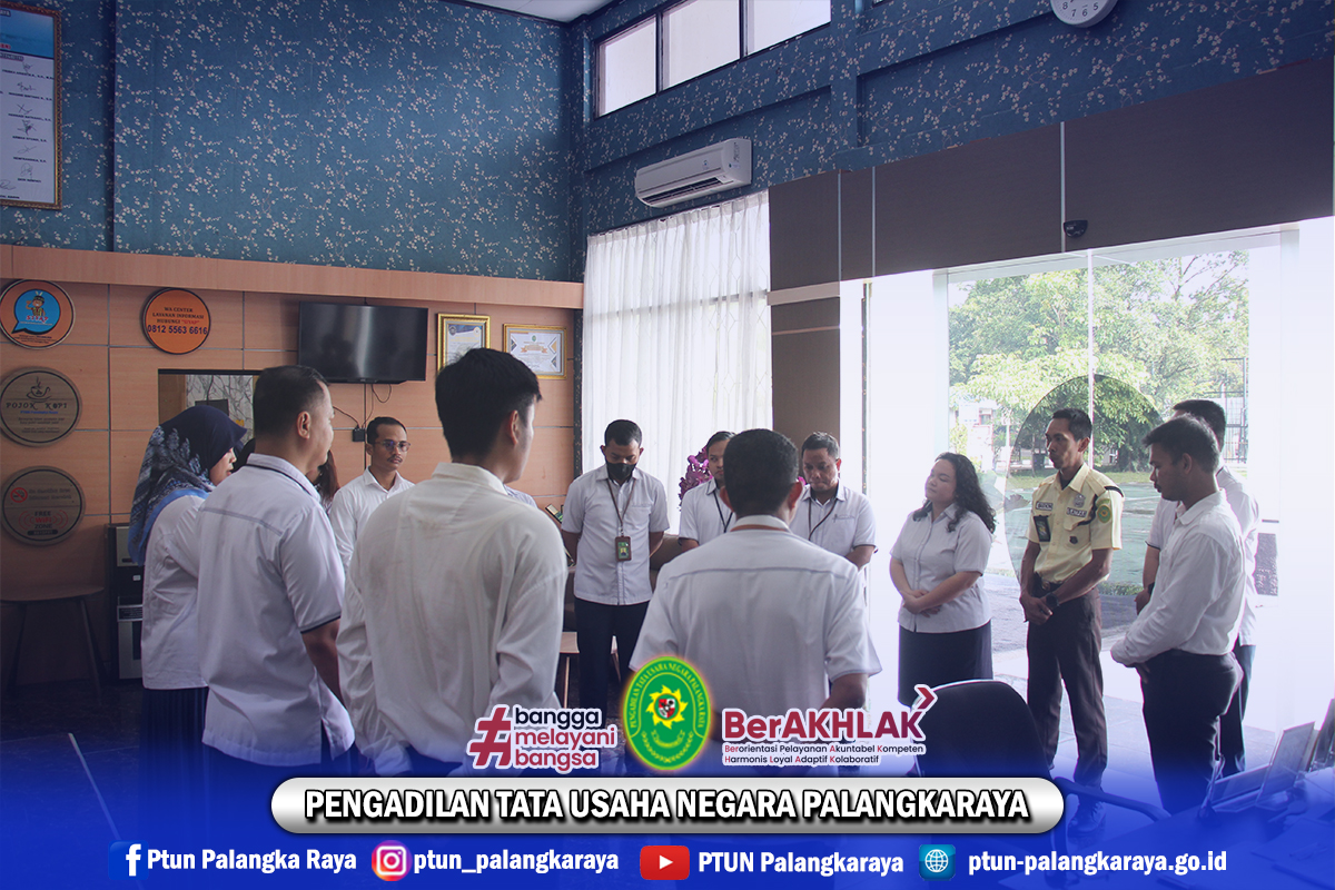 Pada hari Senin, tanggal 22 Desember 2025 Pukul 08.15 WIB, Wakil Ketua PTUN Palangkaraya memberikan pengarahan dalam pelayanan PTSP. Briefing dipimpin oleh Wakil Ketua PTUN Palangkaraya, Ibu Eka Putranti, S.H., M.H.; diikuti oleh Aparatur Sipil Negara, Calon Aparatur Sipil Negara, dan Pegawai Pemerintah dengan Perjanjian Kerja yang bertugas di PTSP.