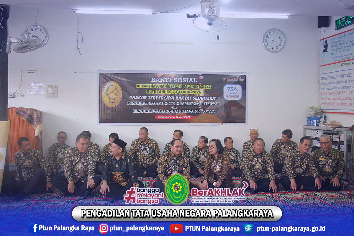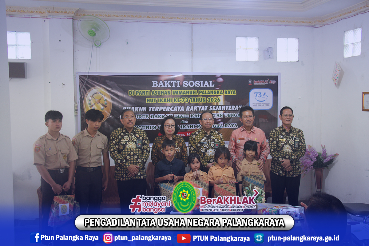 IKAHI Cabang PTUN Palangkaraya mengikuti kegiatan Bakti Sosial pada hari Kamis, 16 April 2026 yang bertempat di Panti Asuhan Berkah Palangka Raya dan Panti Asuhan Immanuel Palangka Raya. Bakti Sosial tersebut merupakan rangkaian kegiatan dalam rangka memperingati Hari Ulang Tahun yang ke 73 IKAHI Tahun 2026.