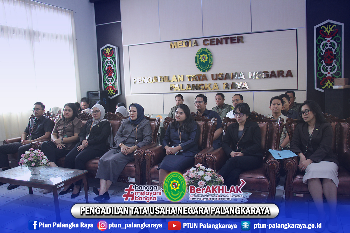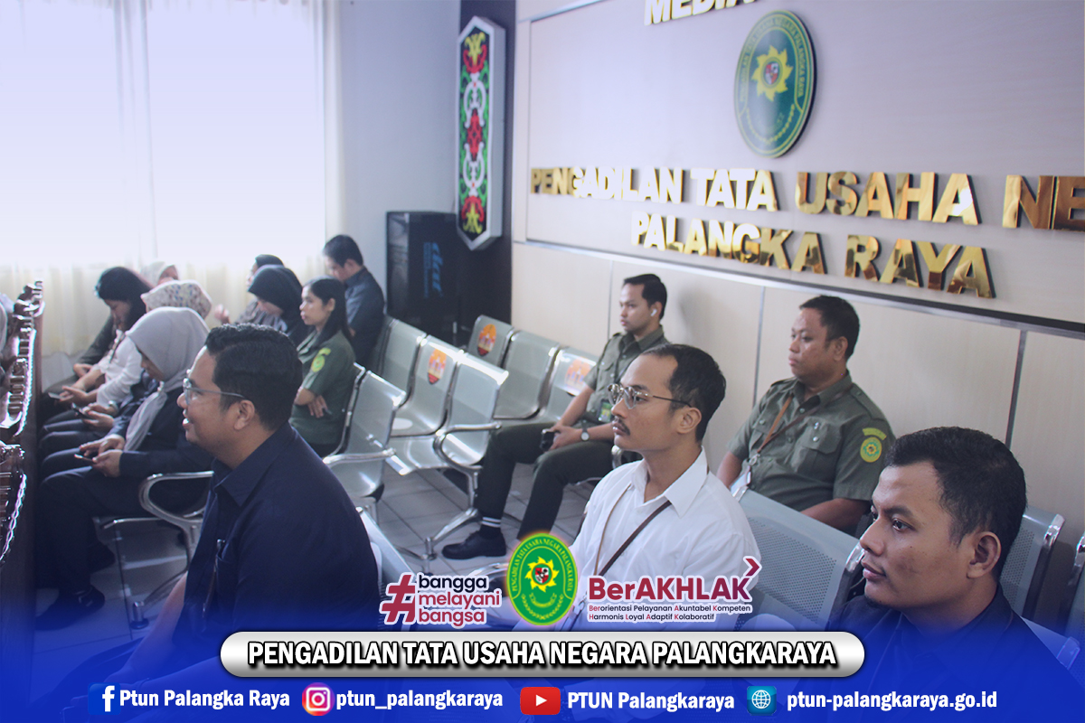 Ketua, Para Hakim, Pejabat Struktural dan Fungsional, beserta pegawai PTUN Palangkaraya mengikuti Pembinaan Dirjen Badilmiltun secara daring melalui zoom meeting bertempat di Media Center PTUN Palangkaraya.