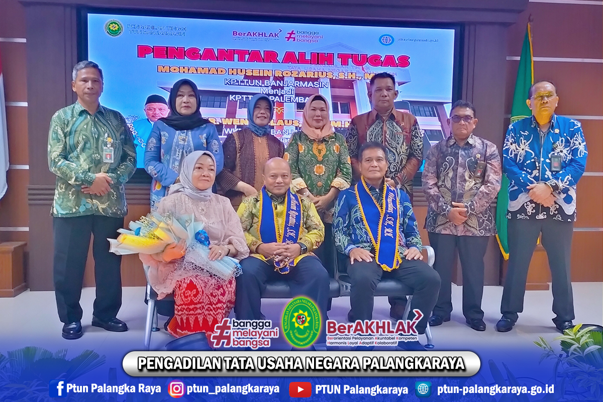 Acara Pengantar Alih Tugas Ketua PTTUN Banjarmasin Bpk. Mohamad Husein Rozarius, S.H., M.H menjadi Ketua PTTUN Palembang dan Wakil Ketua PTTUN Banjarmasin Bpk. Wenceslaus, S.H., M.H. menjadi Wakil Ketua PTTUN Surabaya, bertempat di Ruang Sidang Utama Cakra Lt.1 PTTUN Banjarmasin yang dilaksanakan secara luring dan daring.