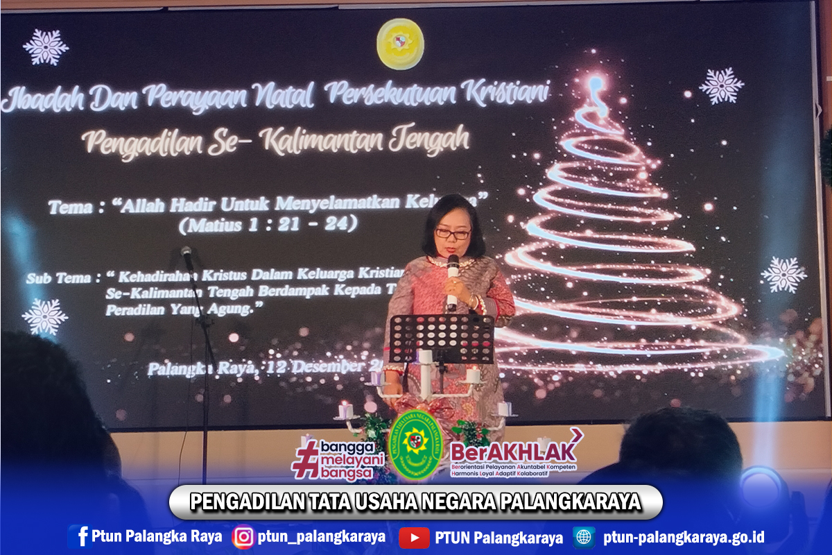 Pada hari Jumat, 12 Desember 2025 bertempat di Ruang Sidang Prof. Dr. H. M. Syarifuddin, S.H., M.H., Pengadilan Tinggi Palangkaraya dilaksanakan Ibadah dan Perayaan Natal Persekutuan Kristiani Pengadilan se-Kalimantan Tengah, dengan Tema : “Allah Hadir Untuk Menyelamatkan Keluarga” (Bdk. Matius 1 : 21-24) dan Sub Tema :