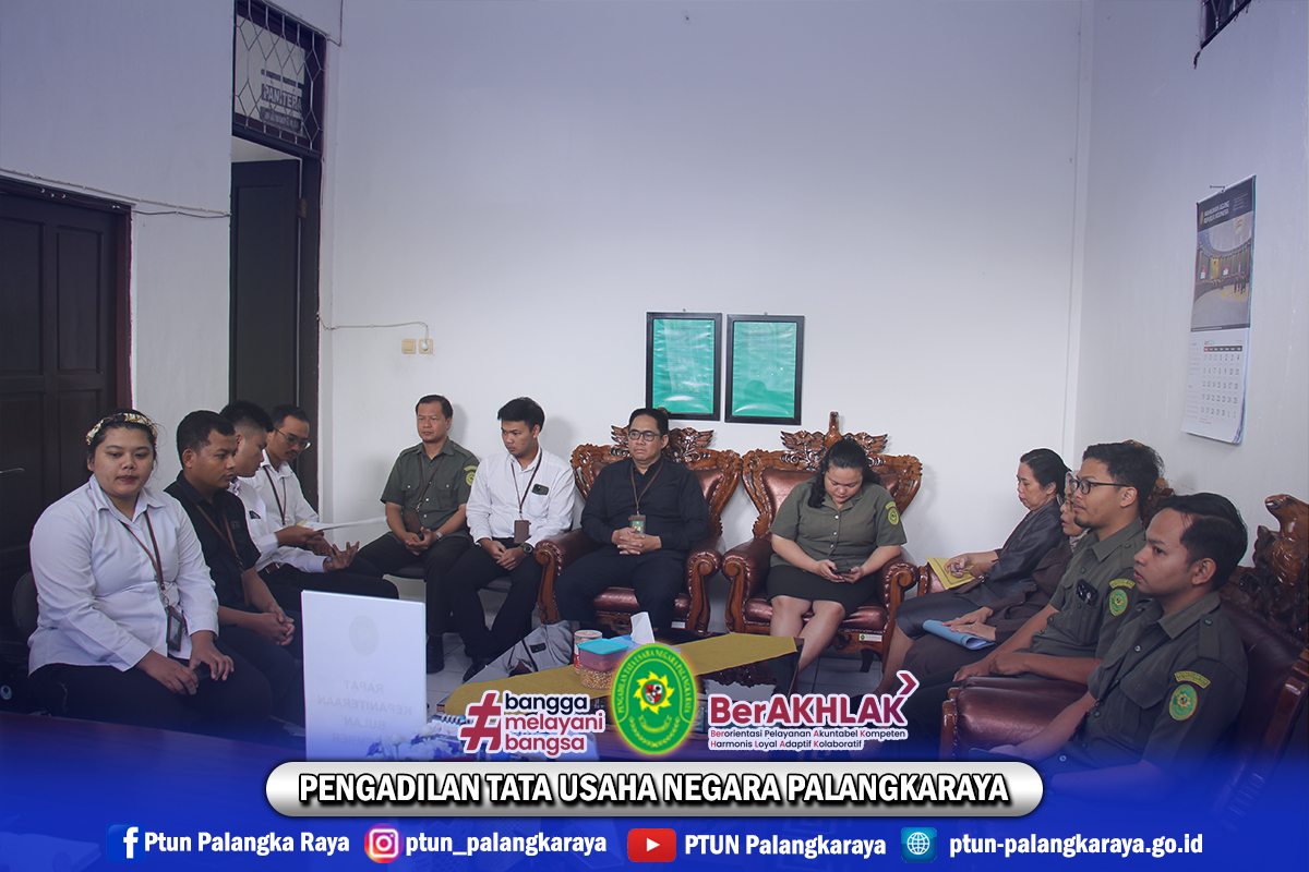 Rapat Kepaniteraan dipimpin Panitera Ibu Eni Sukmawati Siti Mardiyah, S.H, dan dan diikuti oleh Panmud Perkara, Panmud Hukum dan Para Pegawai pada Bagian Kepaniteraan Pengadilan Tata Usaha Negara Palangkaraya yang pada pokok bahasanya sebagai berikut: