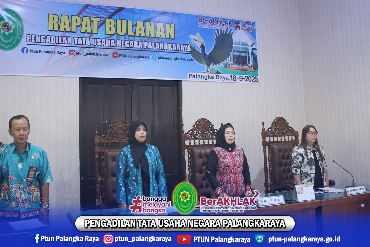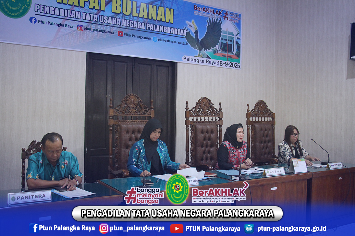 Berdasarkan Surat Undangan Nomor 958/KPTUN.W6-TUN4/UND.HM3.1.3/IX/2025 Perihal Undngan Rapat Bulan September 2025, telah dilaksanakan rapat rutin bulanan Bulan September 2025 PTUN Palangkaraya. Rapat ini dipimpin langsung oleh Ketua PTUN Palangkaraya Ibu Liza Valianti, S.H., M.H. didampingi Wakil Ketua PTUN Palangkaraya Ibu Eka Putranti, Sekretaris PTUN Palangkaraya, Ibu Wiwik Krisnawati, S.Kom., M.Si. sebagai moderator, Panitera PTUN Palangkaraya, Bapak Budiyono, S.H., M.M., dan Notulis Bapak Robby Kurniawan, S.H.