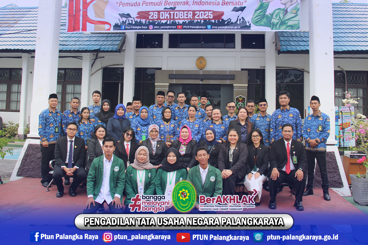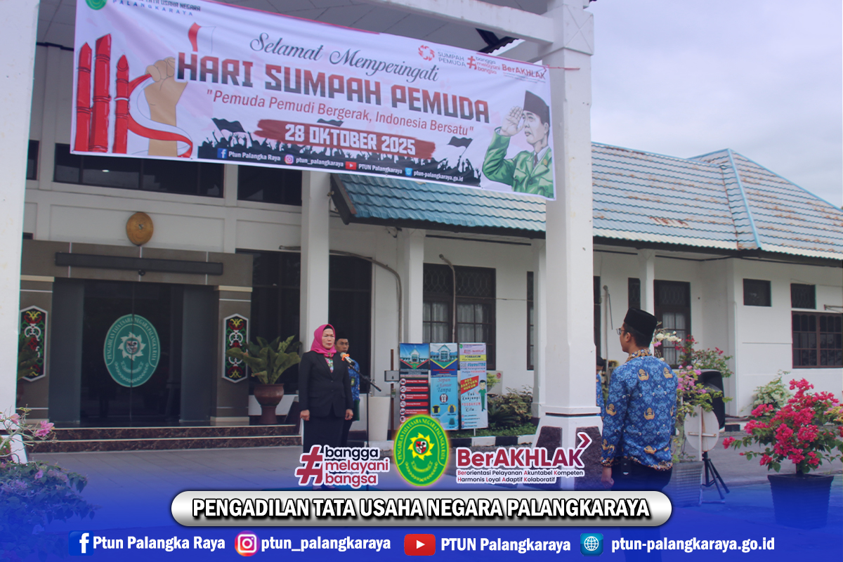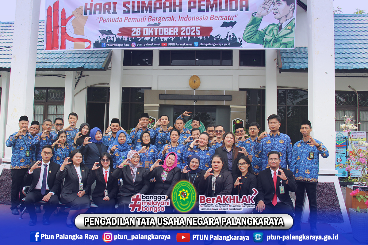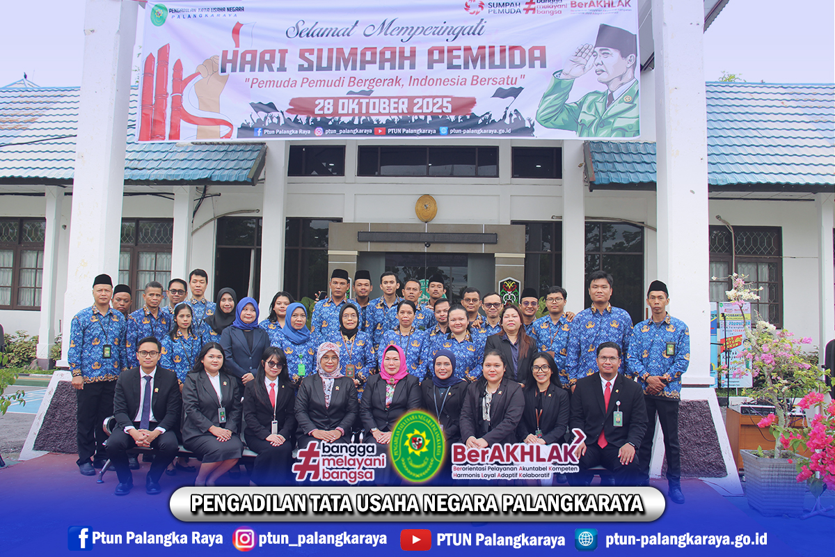 Seluruh Aparatur Pengadilan Tata Usaha Negara Palangkaraya melaksanakan Upacara Bendera dalam rangka memperingati Hari Sumpah Pemuda yang ke-97. Dalam semangat Sumpah Pemuda ke-97, mari kita perkuat persatuan, kobarkan semangat juang, dan wujudkan pelayanan publik yang berintegritas. Bersama, kita tegakkan keadilan untuk Indonesia Maju.