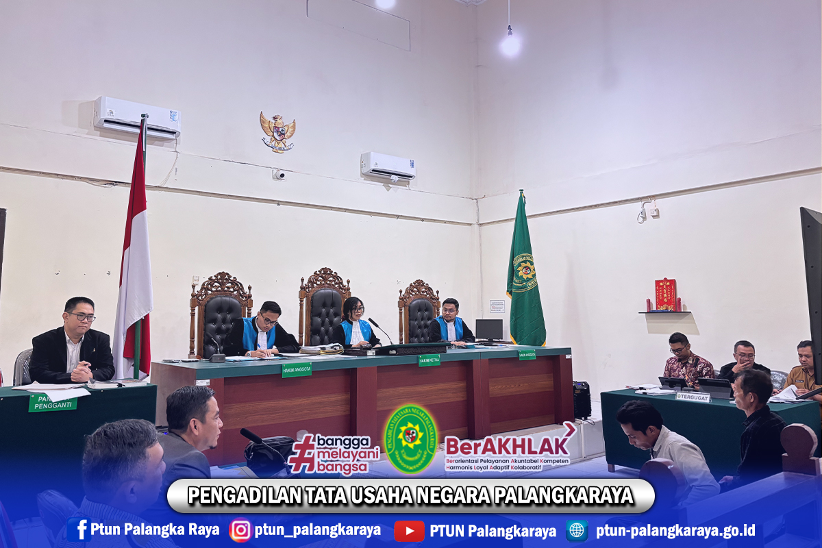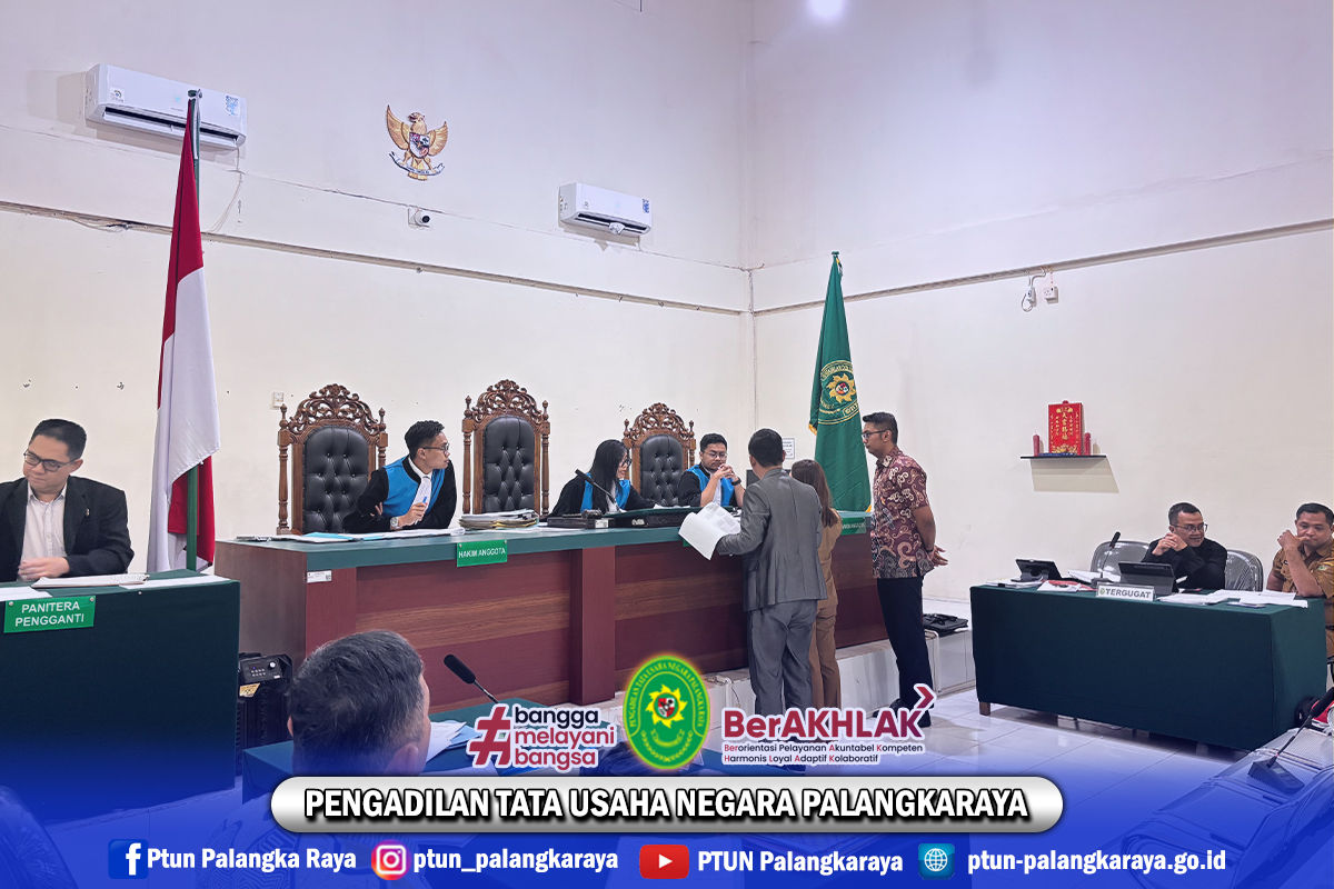 Berdasarkan Surat Tugas Nomor 963/KPTUN.W6.TUN4/ST.KP7.1/IX/2025 dan Nomor 964/KPTUN.W6.TUN4/ST.KP7.1/IX/2025 Ketua PTUN Palangkaraya menugaskan Para Hakim, Panitera Pengganti, dan Petugas Sidang PTUN Palangkaraya. Adapun susunan majelis hakim adalah sebagai berikut: Ibu Friska Ariesta Aritedi, S.H.,M.Kn., Bapak Andi Deni Herwin, S.H., M.H., Bapak Edo Ajidarudin, S.H. Bapak Hernadi Natanael, S.H. sebagai Panitera Pengganti, dan Bapak Arman Efendi, S.H. sebagai Petugas Sidang.