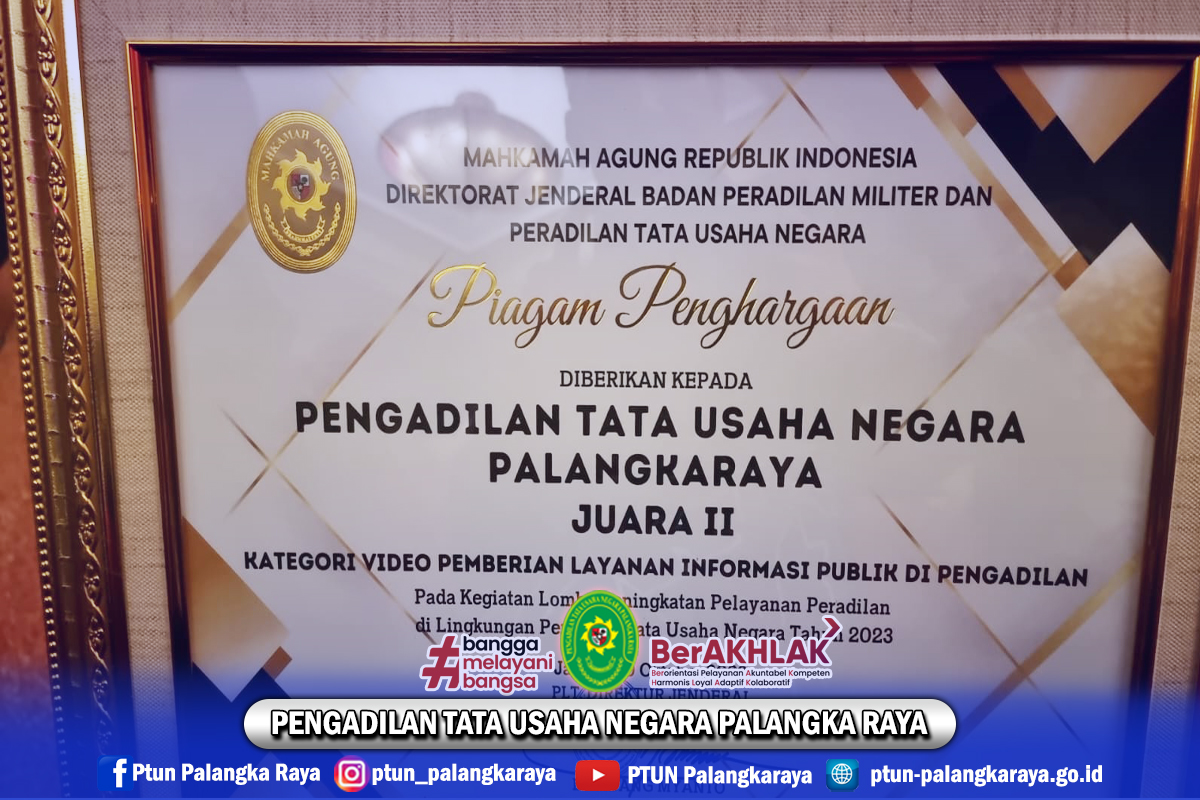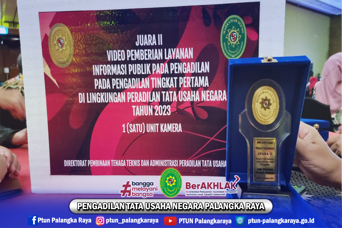 PTUN Palangka Raya juga ikut berpartisipasi dalam Lomba Peningkatan Pelayanan Pengadilan Bagi Seluruh Pengadilan Tata Usaha Negara (TUN) dalam “Lomba Video Pemberian Layanan Informasi Publik Di Pengadilan” dan berhasil meraih Juara Kedua di Lingkungan Peradilan TUN Seluruh Indonesia.